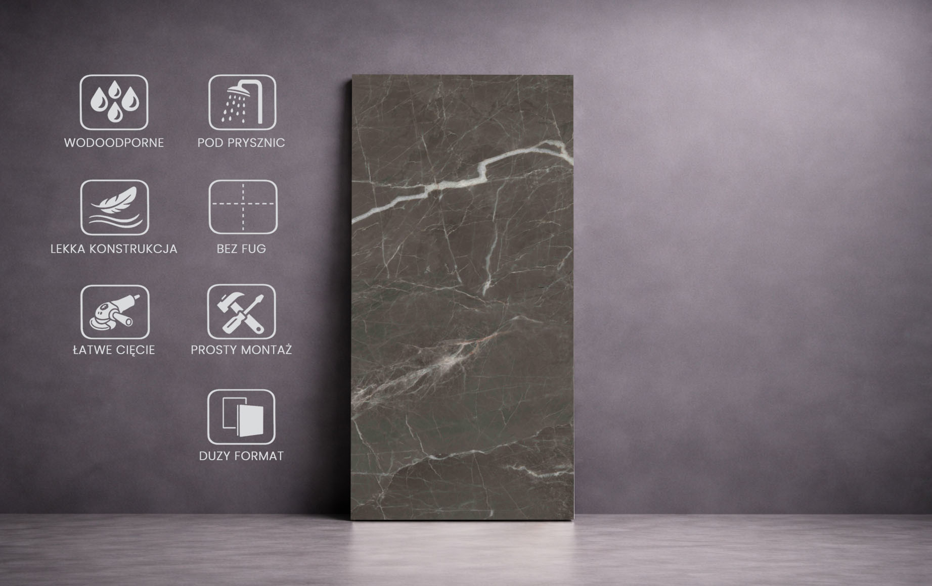 Płyta węglowa posiada odwzorowanie szlachetnego marmuru z głęboką teksturą której układ tworzy ciągłą kompozycję - płyty łączą się sekwencyjnie A-B-C, a ostatni wzór płynnie przechodzi ponownie w pierwszy a wszystko to bez widocznych łączeń. Montując płyty w ten sposób otrzymujemy ciągłość wzoru. Płyty węglowe to idealna alternatywa dla nowoczesnych modernizacji np. łazienki, bez kucia ścian gdzie płyty węglowe montuje się w prosty sposób bez fug i za pomocą kleju montażowego. Panel w porównaniu do płytek ceramicznych jest lekki a jego cięcie jest szybkie i czyste - wystarczy zwykła szlifierka kątowa, bez kurzu i brudu oraz ciężkiego sprzętu.